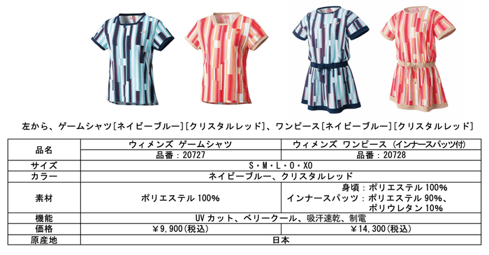 シルエットは、体のラインを美しく魅せるデザインを採用。コート上で躍動感を美しく見せるフレア感のあるアイテムを充実させ、ウエスト位置を高くし脚長効果のあるワンピースやAラインのセットアップなど、新スタイルをご提案いたします。