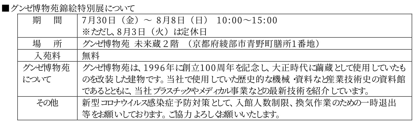 グンゼ株式会社(本社:大阪市北区、社長:佐口 敏康)の創業の地、京都府綾部市にあるグンゼ博物苑では、期間限定で「蚕織錦絵特別展」を開催いたします。