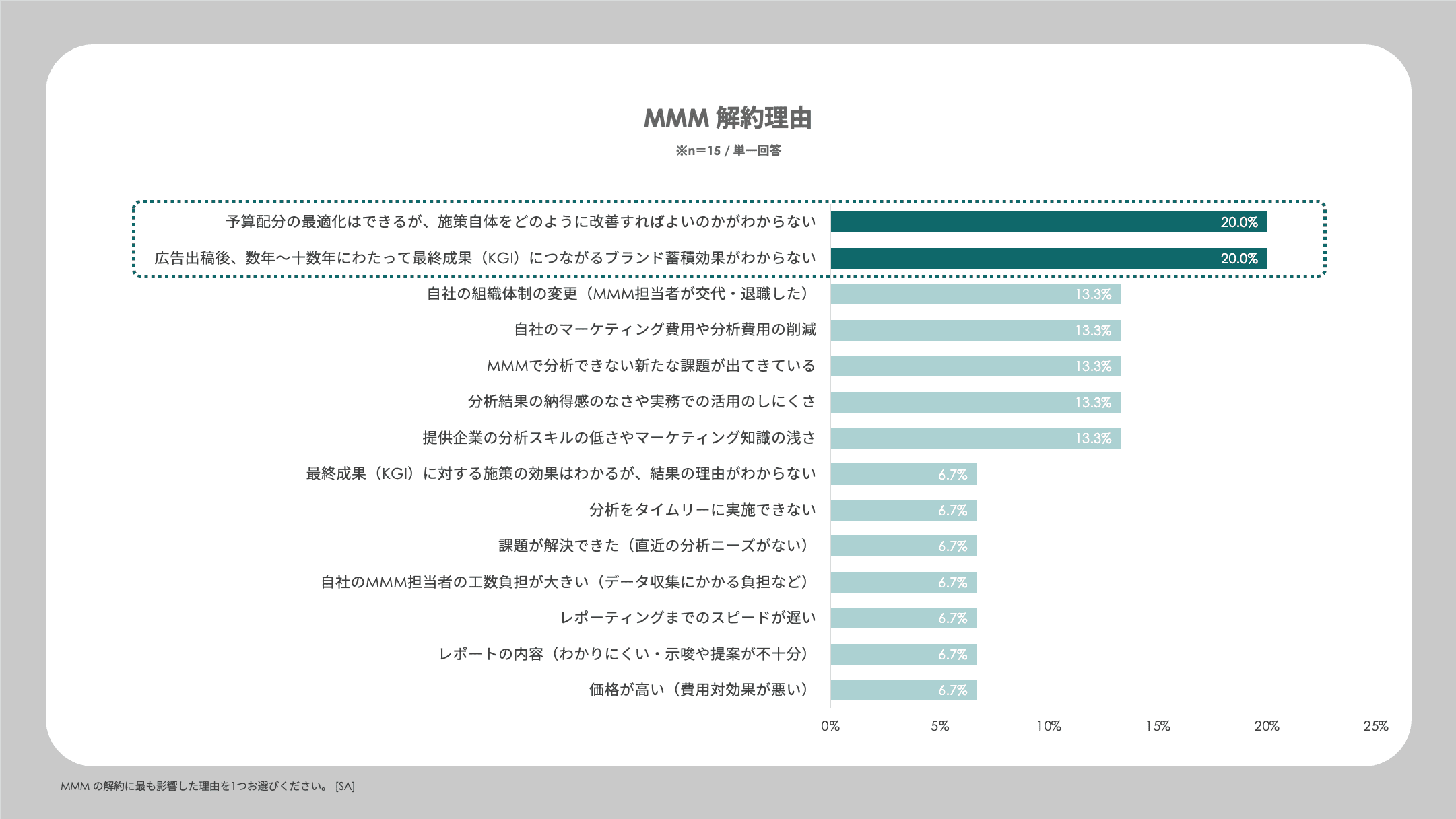 c. 「MMMで分析できない新たな課題が出てきている」と回答した対象者に対してMMMで解決できない課題について聞くと、「予算配分の最適化はできるが、施策自体をどのように改善すればよいのかがわからない(20.0%)」「広告出稿後、数年~十数年にわたって最終成果(KGI)につながるブランド蓄積効果がわからない(20.0%)」がTOP2に挙がった。分析結果を得たあとに具体施策へ落とし込むフェーズと、ブランド蓄積効果の可視化に新たなマーケティング課題があると考えられる。