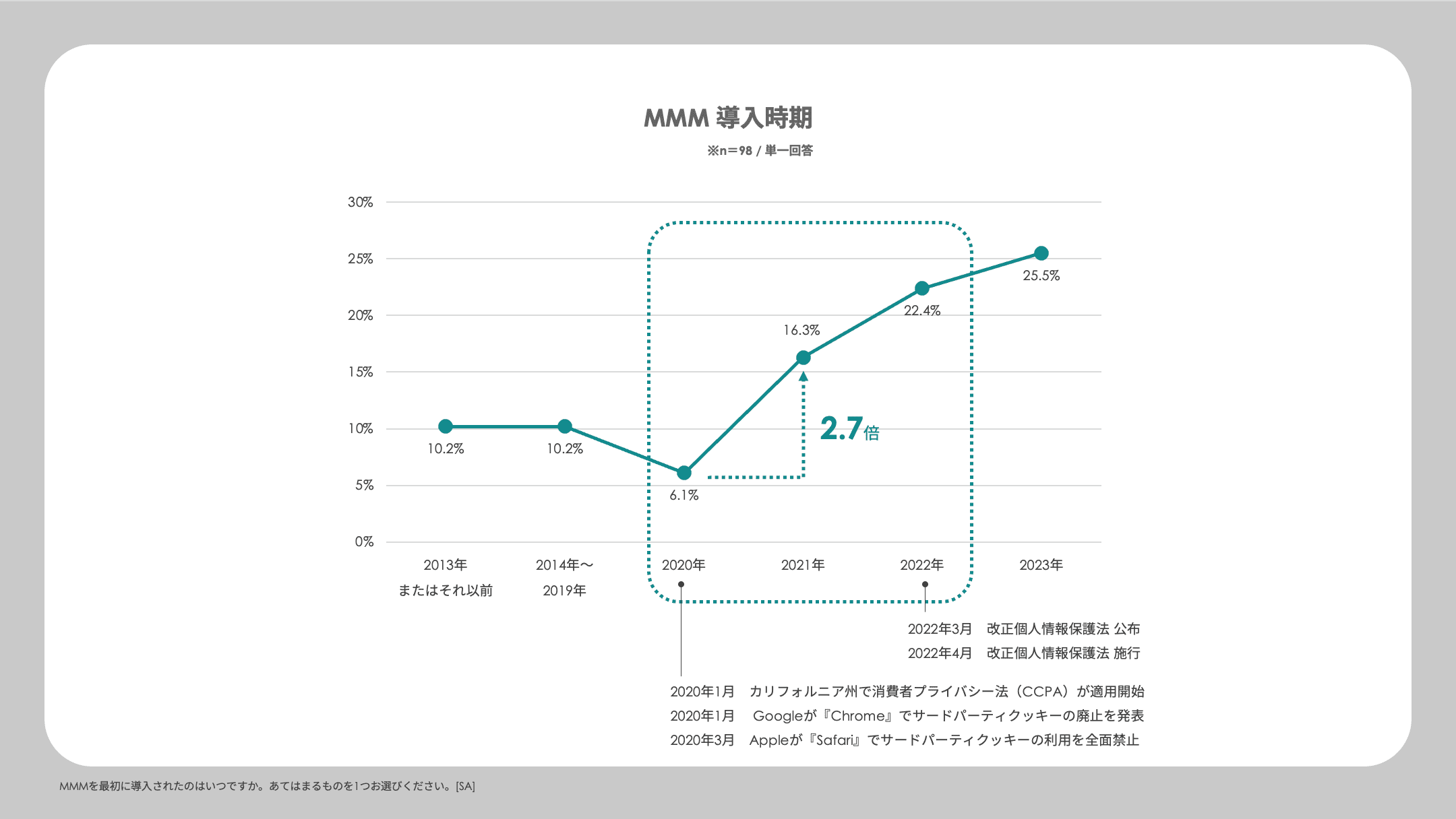b. 次に、本調査にてMMMの導入経験者にMMMの導入時期を聞くと、2020年の導入者が6.1%なのに対し、2021年は16.3%と約2.7倍になっており、2021年にMMMの導入数が急増したことがうかがえる結果となった。2020年にGoogle、Appleがサードパーティクッキー廃止を発表し、2022年3月には日本でも改正個人情報保護法が公布されたことで、サードパーティクッキーの代替手段としてMMMを導入・検討する層が増えたことが増加の要因の一つと推測される。MMM導入数は2022年以降も増加傾向にあり、MMMの市場自体は拡大傾向にあるものの、認知・導入状況を合わせて見ると、マーケティング業界全体にはいまだ十分に浸透していないことがわかる。