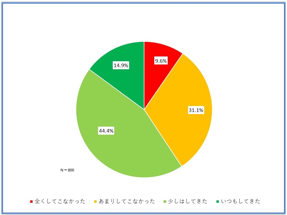 一方で、「これまでの暑い時期に、どの程度対策をしてきたか」との質問については、「いつもしてきた」が14.9%、「少しはしてきた」が44.4%で、対策をしてきた人は全体の6割未満となった【グラフ3】。本調査の監修にあたった関東学院大学准教授の大友章司氏は「ダイエットしようと思っても行動できないなど、動機と行動の乖離の現象として考えられる。人は、やりたいという動機を持っていても面倒だとか、それまでの習慣が障害となって行動に結びつけることができない。実際に行動している人を見ると、熱中症を経験している人などであり、熱中症が自分にも起こるリスクとして捉えることが重要である」とコメントしている。