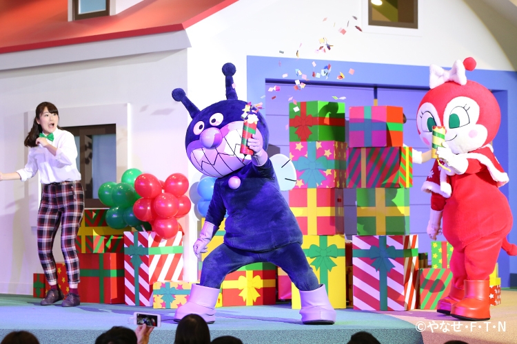 クリスマス衣装を着たアンパンマンたちが登場。たくさんのプレゼントボックスを使ってできたものは…?