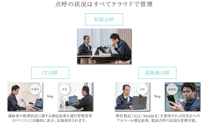 アルコールチェックや点呼が義務付けられているすべての事業者様へ。安全、安心、健康を実現する業務インフラとしてご活用ください。