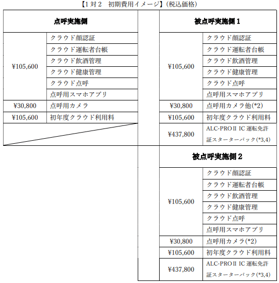 以下は、1対2(酒気帯び確認は、被点呼実施側2ヶ所)で IT点呼を行う場合の初期費用です。