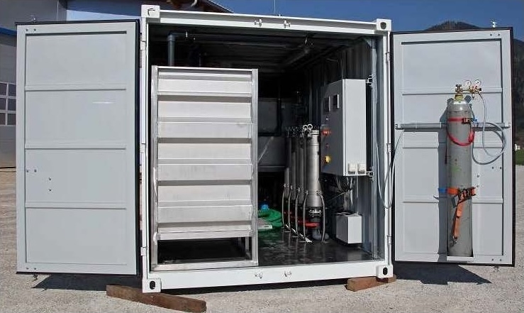 約6m×2.4m×2.6m(L×W×H)の大きさのコンテナの中に濾過を行うための処理装置が入っています。