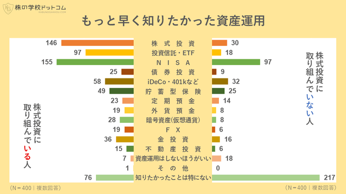 今回の調査では、自分自身が資産運用について「もっと早く知りたかった」と思っていることについても尋ねました。株式投資に取り組んでいる人では、やはり1位は「NISA」で、155人が選んでいます。わずかの差で続くのは「株式投資」の146人で、「投資信託・ETF」は97人でした。
