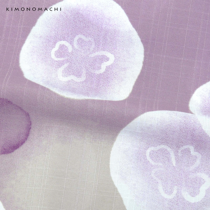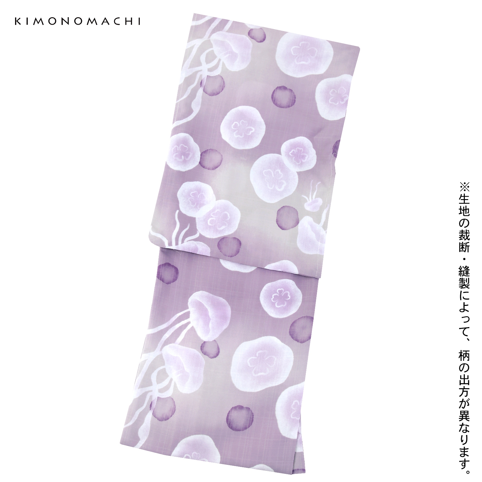 淡い紫色とグレーのぼかしの地。深い紫色の水玉と共に、白のミズクラゲが漂っています。淡くにじんだような表現がふわりと透明感のある印象です。