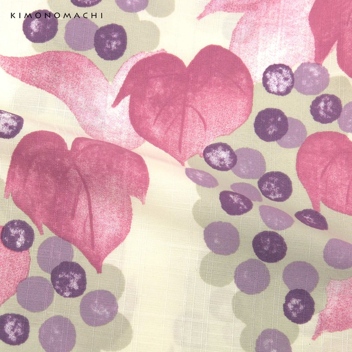 アイボリーの地に落ち着いた紫色系のぶどう。グレーの影、紫と藤色の実に、淡い紅紫色の葉。ところどころ白で淡くにじんだような表現がかわいらしさを感じさせます。