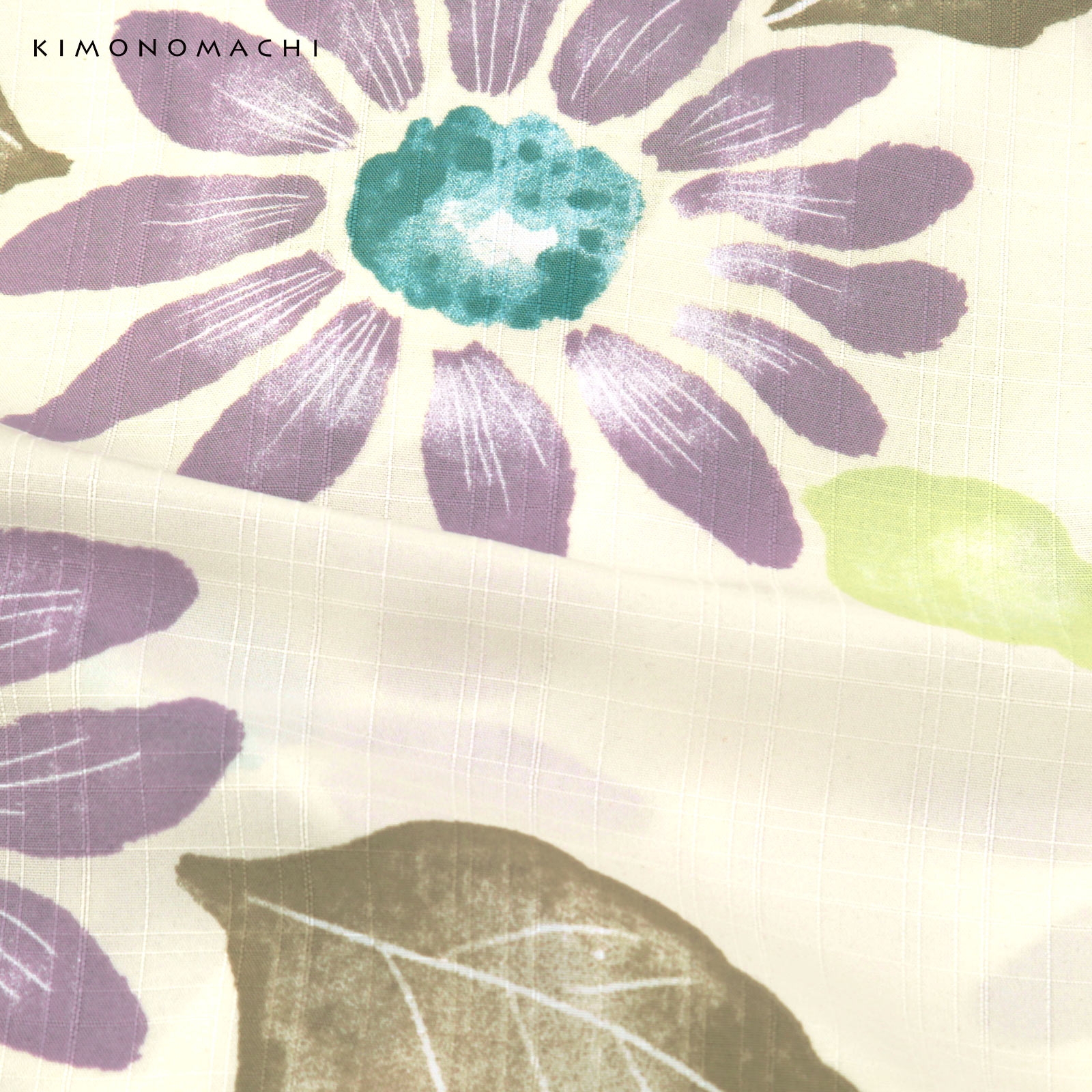 オフホワイトの地にグレイッシュな紫色のひまわり。青緑の花芯、薄黄緑色、鈍いカーキ色の葉。ところどころ白で淡くにじんだような表現が涼し気な印象です。