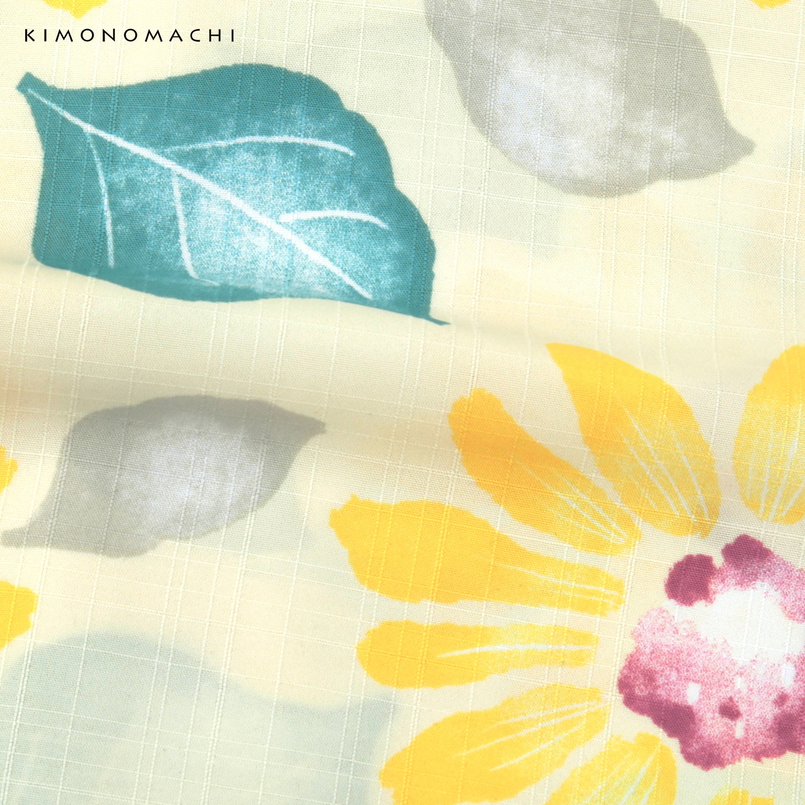 オフホワイトの地に明るい黄色のひまわり。小豆色の花芯、浅葱色、薄グレーの葉。ところどころ白で淡くにじんだような表現が夏らしさを感じさせます。