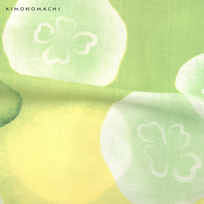 淡い若葉色と薄い黄色のぼかしの地。深緑色の水玉と共に、白のミズクラゲが漂っています。淡くにじんだような表現が水中の揺らめきを感じさせます。