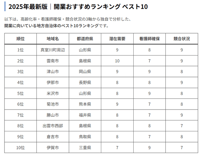 2025年6月、医療・介護事業者向けの経営支援を行う4X株式会社(東京都渋谷区 ※以下4X)は、独自に収集・分析した全国の市区町村別データをもとに、訪問看護ステーションの開業に適した地方自治体ランキング「2025年最新版|開業おすすめランキング ベスト10」を発表しました。