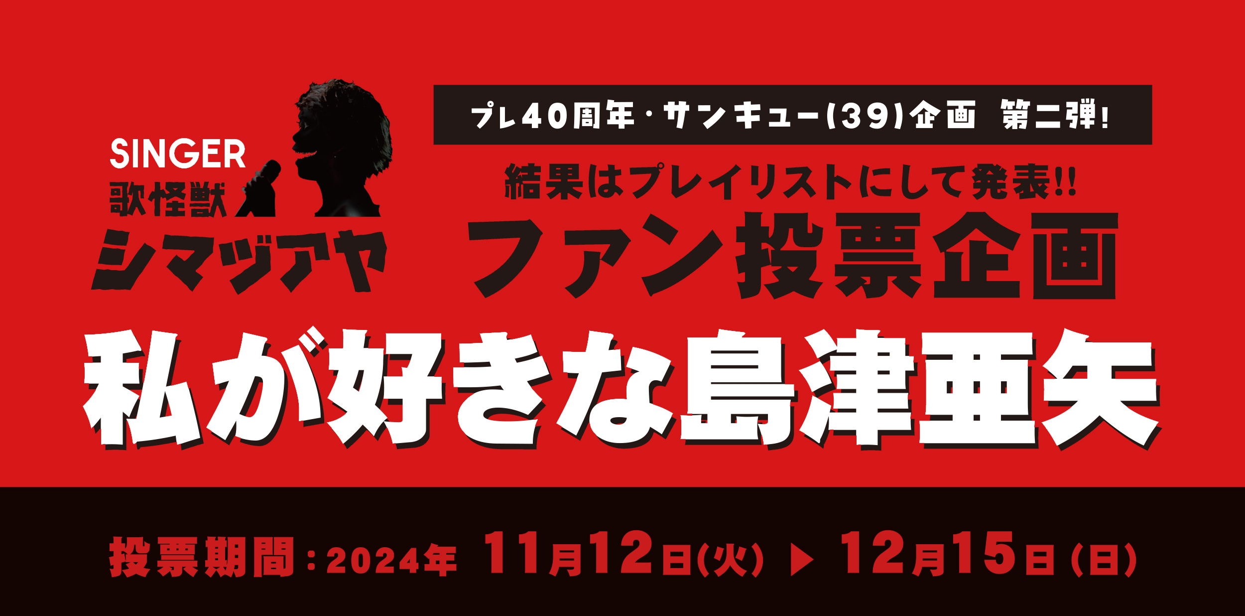 結果は、現在数々の楽曲のミュージックビデオを解放中のYouTube「島津亜矢【公式】歌怪獣チャンネル」にて、上位の楽曲をプレイリストにして後日発表される。投票に参加いただいた方のなかから抽選で39名様には「オリジナル缶バッジ」をプレゼントする。