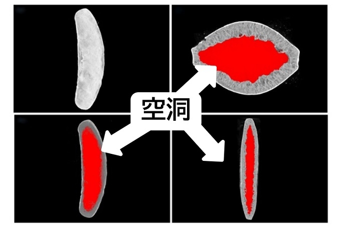 「亀田の柿の種」の大きな特徴はその形状にあります。2020年に実施したX線CT解析を用いた調査では「亀田の柿の種」は生地の中に大きな空洞があることが明らかになりました。徹底して薄さにこだわった生地を高温で一気に焼き上げることで中がぷくっと膨らみ、空洞を生み出します。この空洞構造が、「亀田の柿の種」ならではのカリっとした軽快な食感の秘訣となっています。