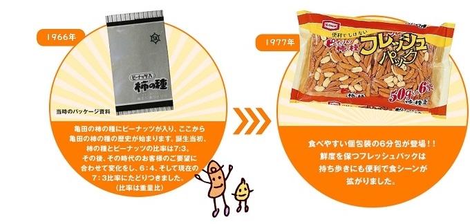 「亀田の柿の種」にピーナッツが入ったことにより、1966年からその歴史をスタートさせた「亀田の柿の種」。そこから約58年間に渡って、現在の新パッケージに至るまで時代の変化と共に様々な進化を遂げてきました。長年にわたって愛されるロングセラー商品となった「亀田の柿の種」のパッケージのこれまでの変遷をご紹介します。