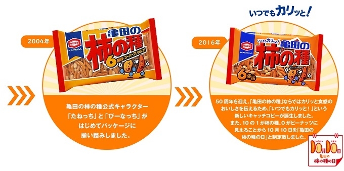 新パッケージでは、「亀田の柿の種」の独自性である「カリッと食感」を追求したパッケージリニューアルとなっています。これまでの“お父さんの定番菓子”というようなイメージから、“いつでも・どこでも・だれとでも楽しめるお菓子”としてあらゆるシーンで様々な方に手に取っていただけることを目指しました。