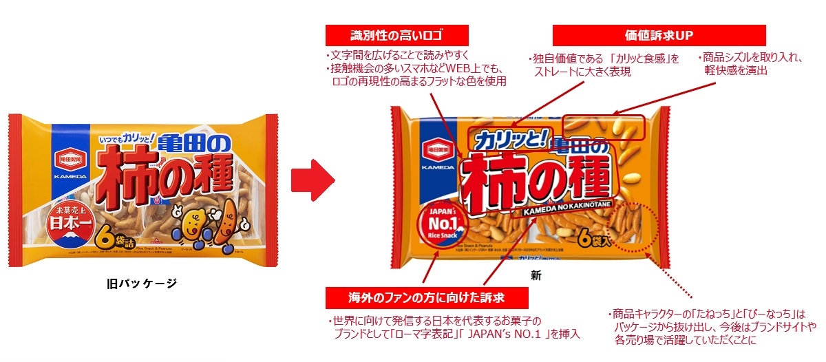 米菓No.1※ブランド『亀田の柿の種』 8年振りのパッケージリニューアル 2024年2月上旬より全国展開 「カリッと食感」へのこだわりを表現!58年間愛される人気のヒミツはその食感!?