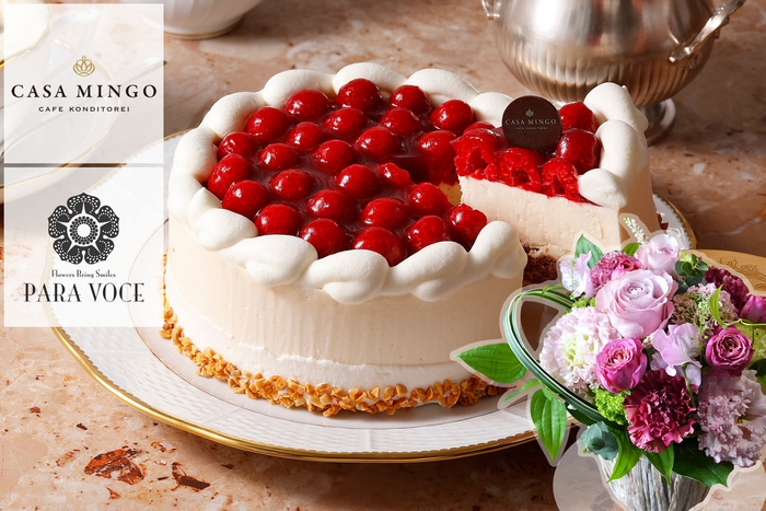 洋菓子店カサミンゴーが誇る「シュス木苺レアチーズケーキ」などの人気ケーキと、母の日限定のオリジナルフラワーアレンジメントをセットにしたこのギフトは、目で楽しみ、舌で味わい、心に残る至福のひとときをお届けします。