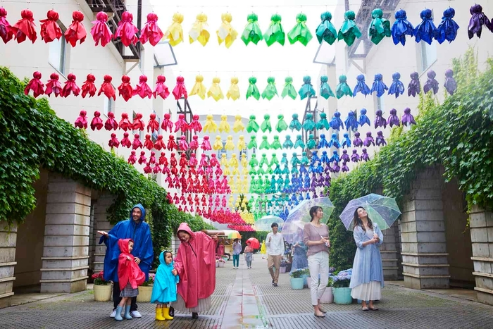 150mのメインストリート「ピーマン通り」に、晴れを願う「てるてる坊主」ではなく、雨を待ちわびる「ふれふれ坊主」が並びます。今年は、「ふれふれ坊主」の数が昨年の1.5倍の1,500個に増え、切れ目なく装飾されます。これは、全長約40cmのふれふれ坊主がグラデーションで雨空を彩る、ここでしか見られない景色です。さらに気分が上がるように、カラフルなポンチョや傘も用意。下向きがちな梅雨の時期に、カラフルなアイテムに身を包み、ふれふれ坊主を見上げて雨の日を楽しめます。