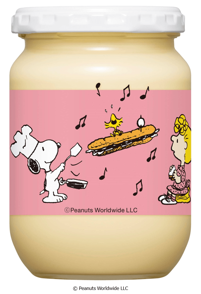 食卓に置くと見た目にも楽しい「スヌーピー」をはじめとする「ピーナッツ」のキャラクターをデザインした、瓶入りの「キユーピー マヨネーズ」です。
