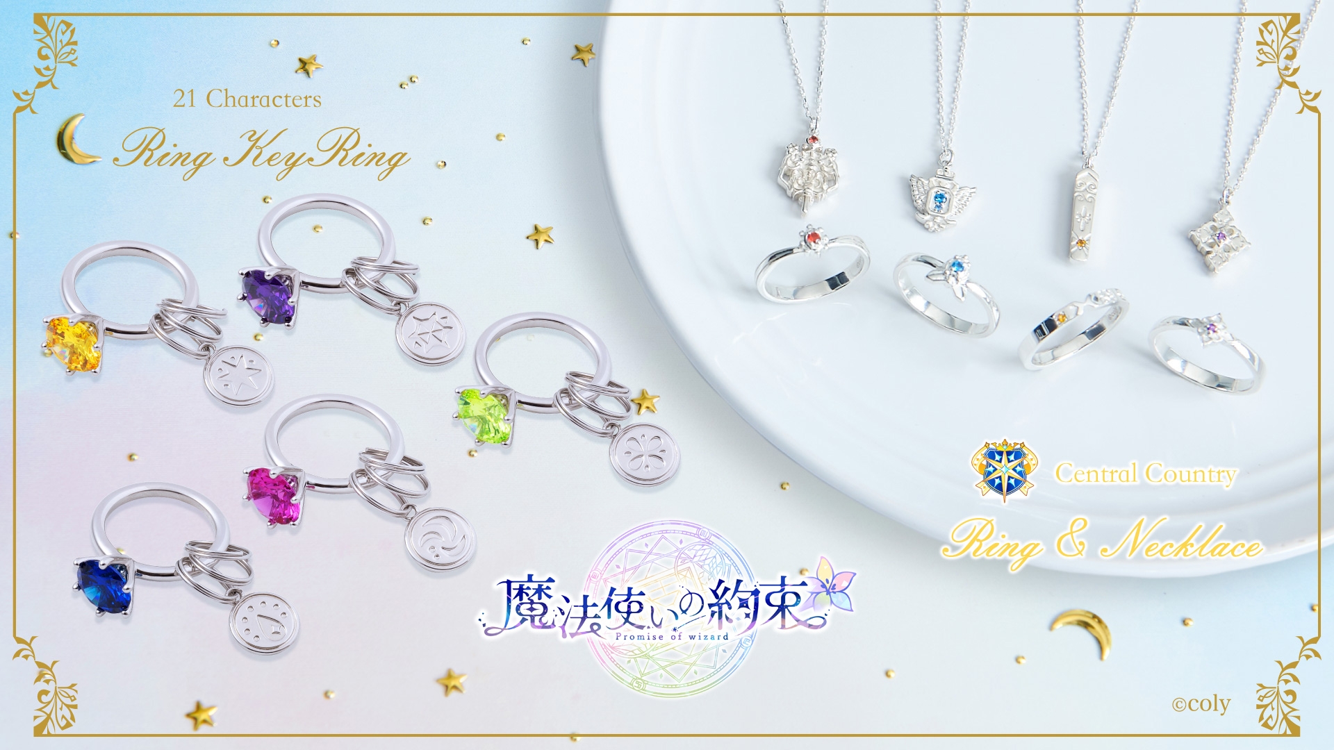 中央の国の魔法使いをイメージしたシルバーリング&ネックレス、各国のモチーフをあしらったキーリング(キャラクター選択可) 全29種のラインアップ
