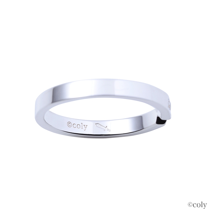 剣の模様をリングに取り込んだ平打ちタイプのデザインに、イメージカラーストーンをセット。内側には魔道具のアイコンを刻印しました。シンプルなストレートリングなので、普段使いしやすいデザインです。