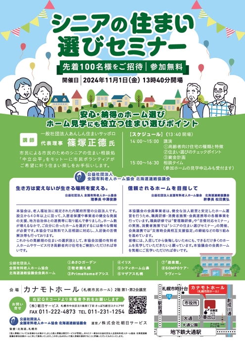 公益社団法人全国有料老人ホーム協会 北海道連絡協議会が、2024年11月1日(金)に「シニアの住まい選びセミナー」(会場:カナモトホール、後援:北海道、札幌市)を開催いたします。