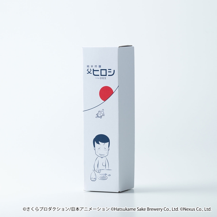 オリジナルラベルは、静岡県産のマグロの刺身を肴に日本酒を嗜むヒロシのイラストを使用したデザインです。ヒロシの後ろに、静岡県の代名詞ともいえる「富士山」と「初日の出」、「亀」を配置し、初亀醸造らしさを演出。「亀」のイラストは、さくらももこさんがデザインしたものを使用しています。本商品は、同様のデザインが施された紙箱付きのセットです。