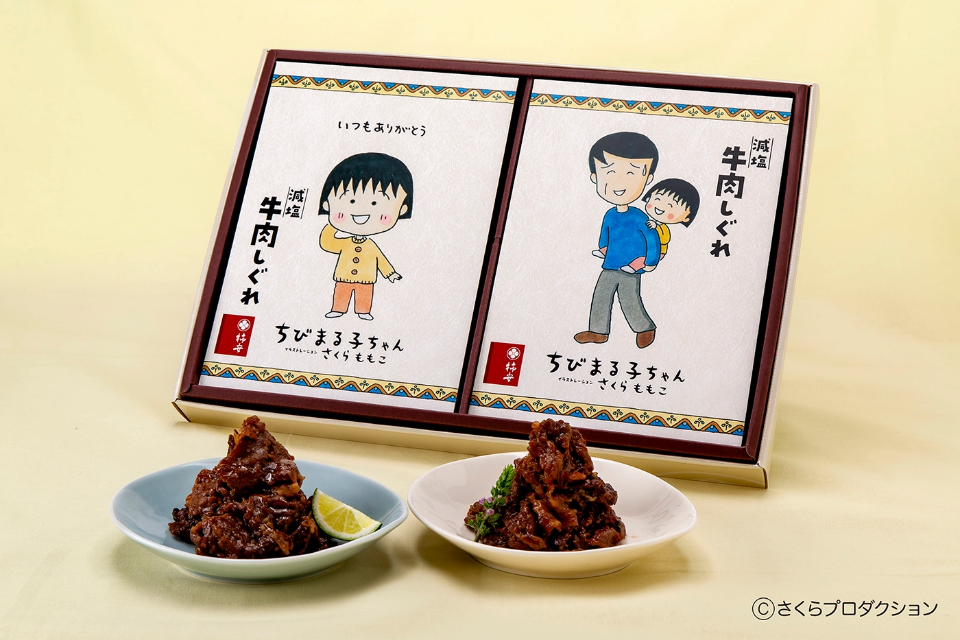「ヒロシ&まる子 減塩 牛肉しぐれ詰合せ」のパッケージには、まる子とヒロシのイラストを使用しています。パッケージのひとつは、少し照れ顔を浮かべるまる子に〝いつもありがとう〟のメッセージを添えたデザイン。もうひとつには、ヒロシがまる子をおんぶするイラストで、お父さんと幼少時の娘の懐かしい思い出が回想されるようなデザインになっています。「減塩 牛肉しぐれ」の単品商品は、愛くるしいまる子が描かれた華やかなピンクカラーのパッケージデザインです。どちらも数量限定での販売となるため、父の日をはじめ、お誕生日や手土産など大切な方への特別なプレゼントにもおすすめです。