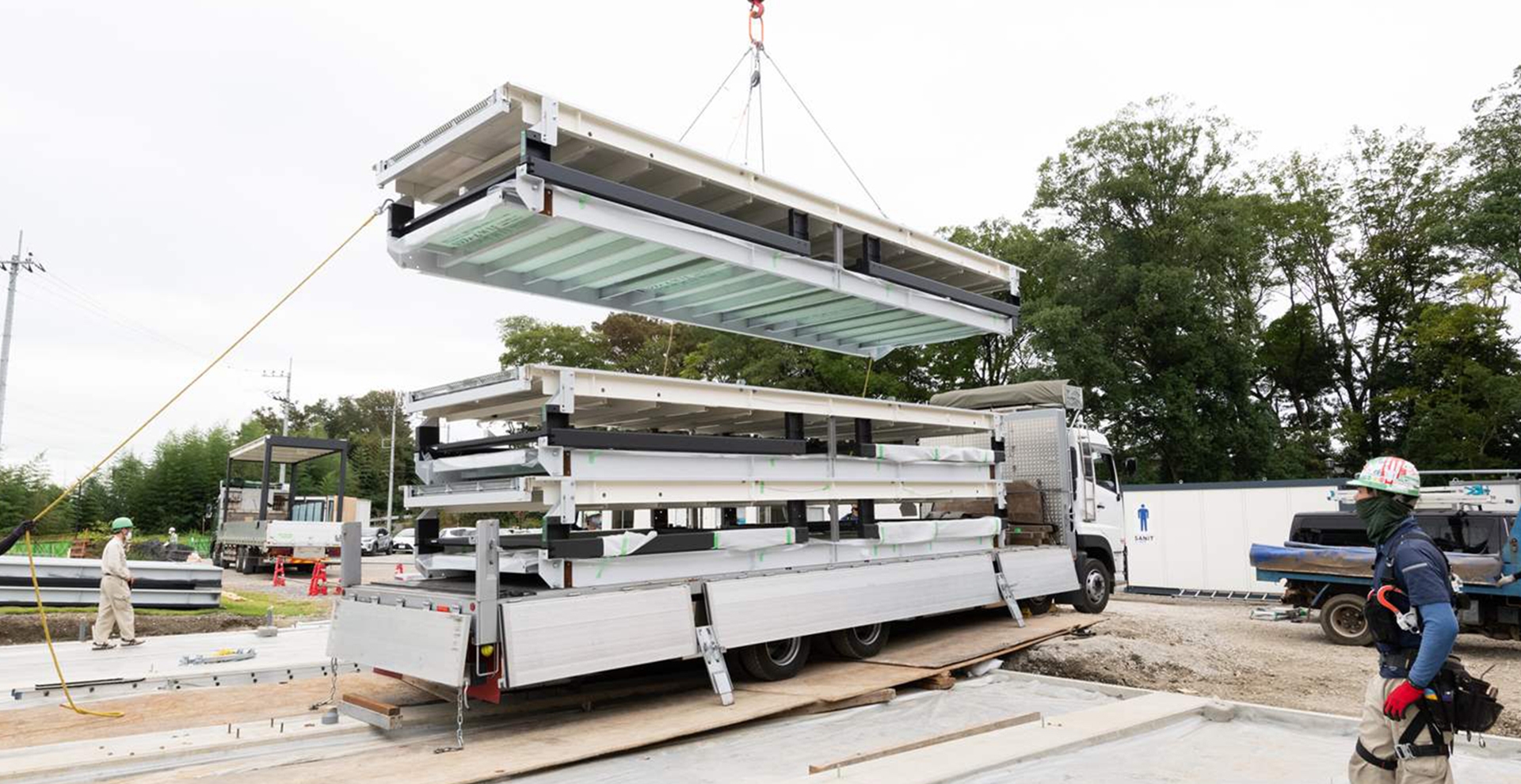 モバイルスペースは、工場で生産し、トラックで現地に運び、クレーンでつり上げて設置する工業化建築プロダクトです。