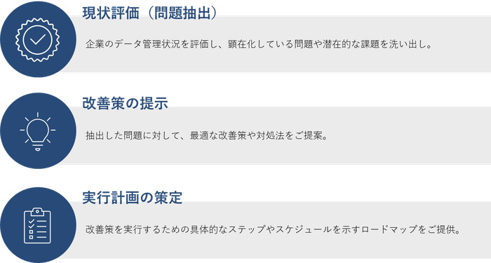 「データマネジメント・アセスメントサービス」は、企業のデータ管理状況を総合的に評価し、明確な課題と潜在的な問題を特定するサービスです。これにより、企業のデータ戦略を実行可能にし、データ品質の向上やコスト削減、業務の効率化を実現します。