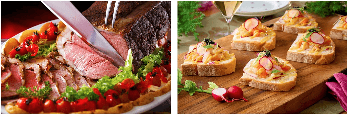 左:西海橋コラソンホテル開業以来のスペシャリテ、「ローストビーフ」。しっとりと焼き上げる調理法はもちろん、こだわりはソース。季節ごとに2種のソースをご用意し、何度食べても飽きの来ない美味しさでおもてなしいたします。