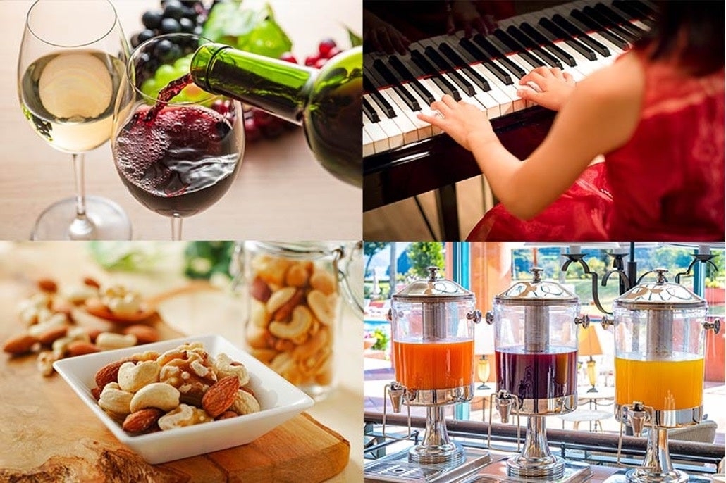 到着時からご自由にお楽しみいただける生ビールや赤白ワイン、ソフトドリンクでまずは旅の疲れを癒すお客様。