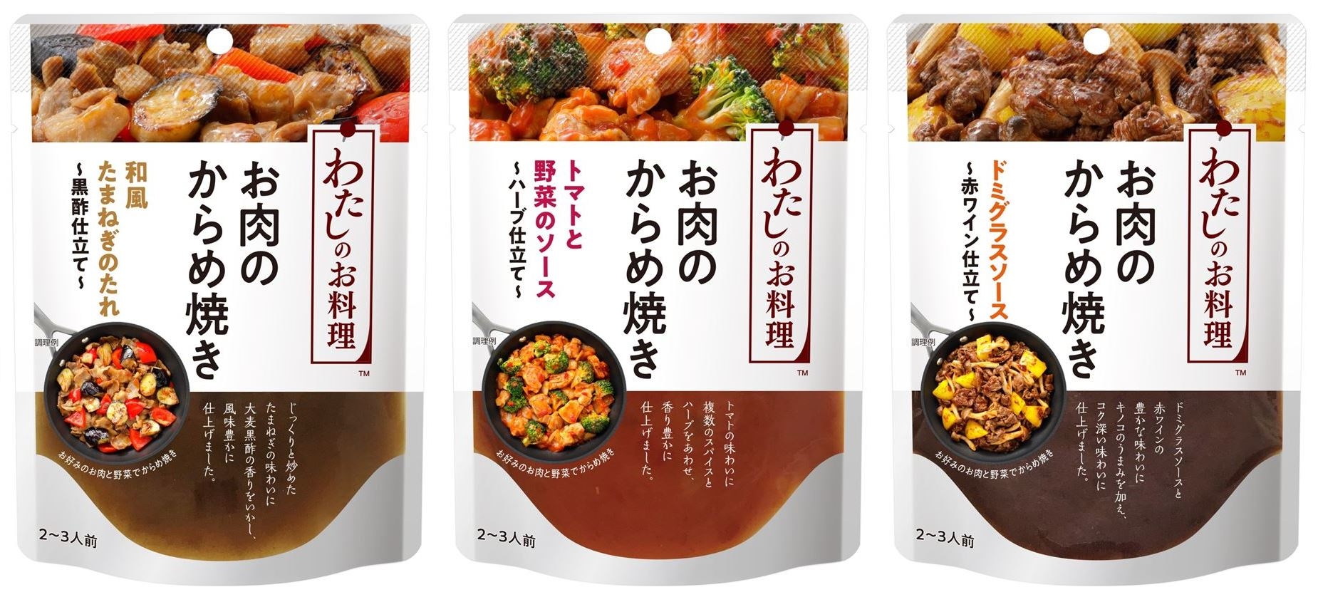 「わたしのお料理」ブランドサイトで新たに紹介する商品は、3月1日(月)に新発売する「和風たまねぎのたれ~黒酢仕立て~」、「トマトと野菜のソース~ハーブ仕立て~」、「ドミグラスソース~赤ワイン仕立て~」の3品です。