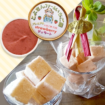 イチゴを限界まで配合(70%)した、イチゴを感じるジェラート2個と、 安土町の洋菓子店さんと協力して開発した六次化商品イチゴのスイーツ2種セットです