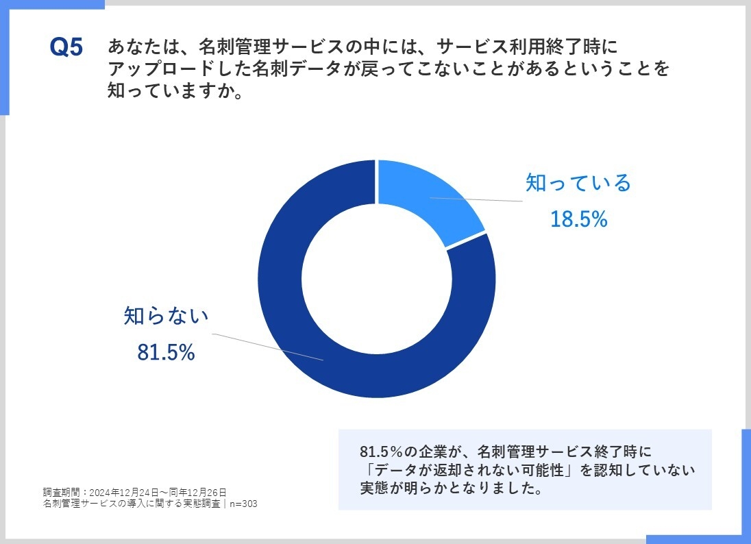 調査によると、サービスの利用終了時に名刺画像データが返却されない可能性については、81.5%が「知らない」と回答しており、88.2%がこれに「不安を感じる」と答えています。そこで、もし名刺画像データの返却を保証する名刺管理サービスがあるとしたら興味があるかを調べたところ、84.8%が名刺データの返却を保証する名刺管理サービスに関心を寄せており、その理由として「顧客データの継続的な管理ができるから」(70.4%)が挙げられました。