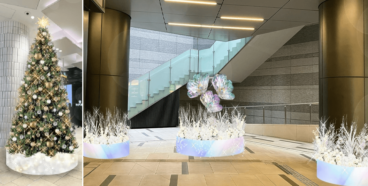 1Fメインエントランスにある約4mのクリスマスツリーや、オーロラカラーのジャイアントフラワーで彩ったB1Fサンクンガーデン装飾がクリスマスムードを高めます。