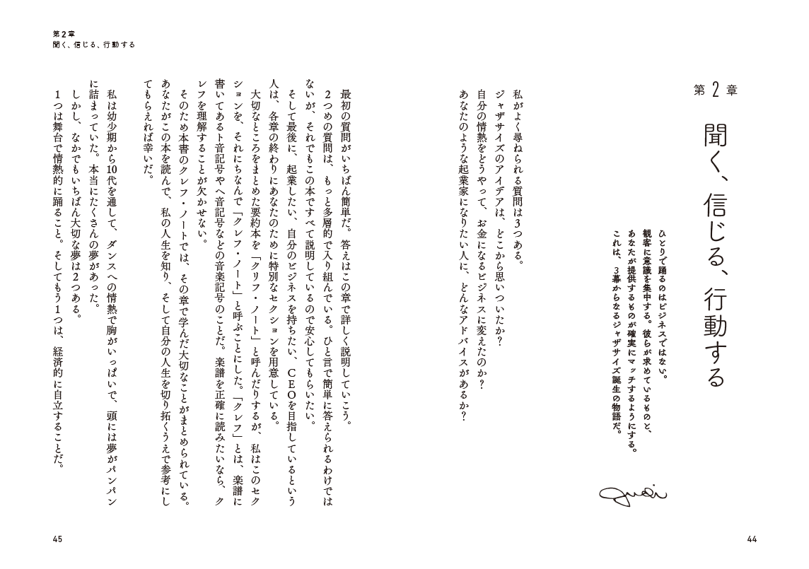 途中で事業を売却したり、株を公開したりすることもなく、今でもオーナーとして経営に携わり、現場に出てダンスのインストラクターを続けている彼女の生い立ちからダンスへの情熱までを、余すことなく語った一冊です。