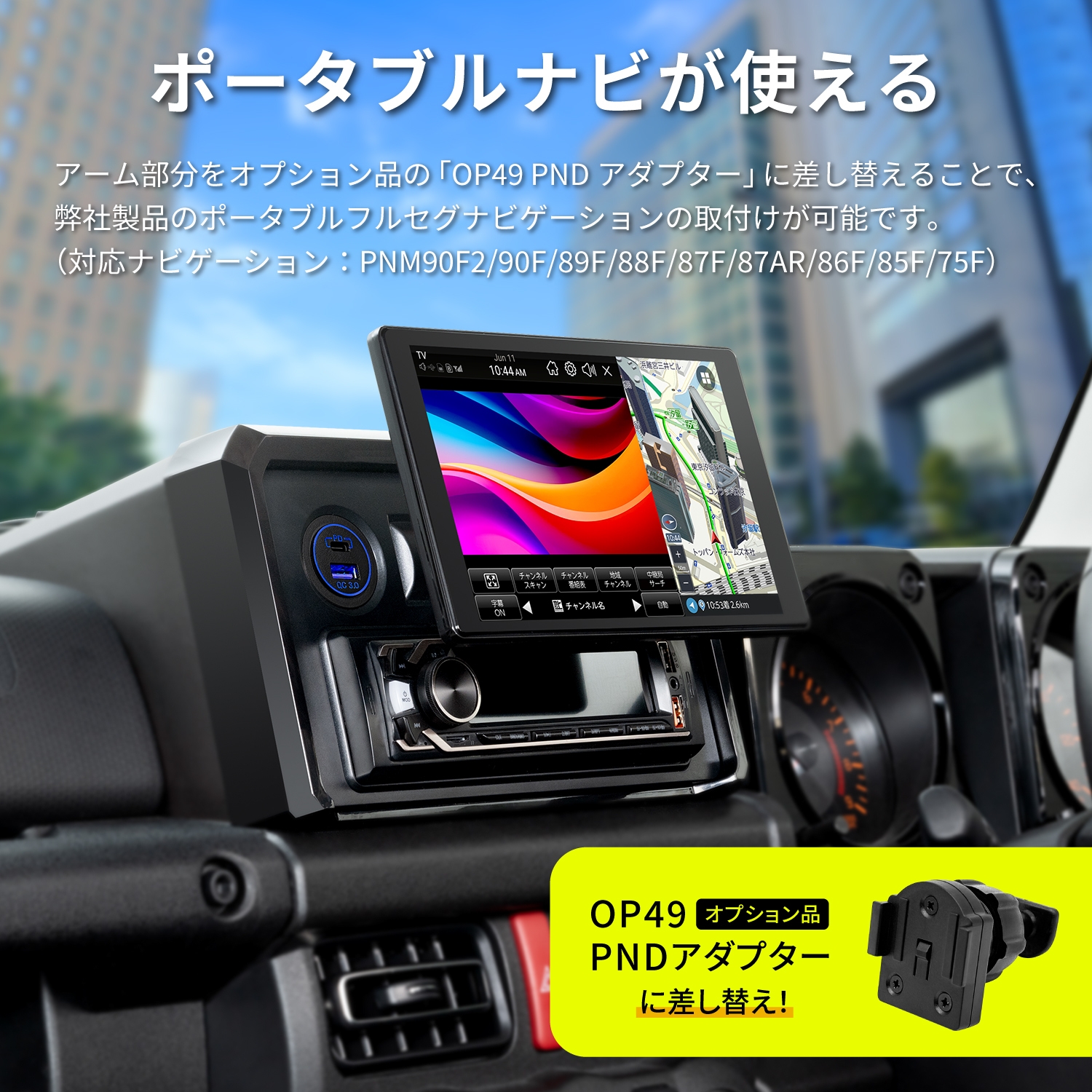 - アーム部分をオプション品(OP49 PNDアダプター)と差し替えることで、当社ポータブルフルセグナビゲーションの取り付けが可能。