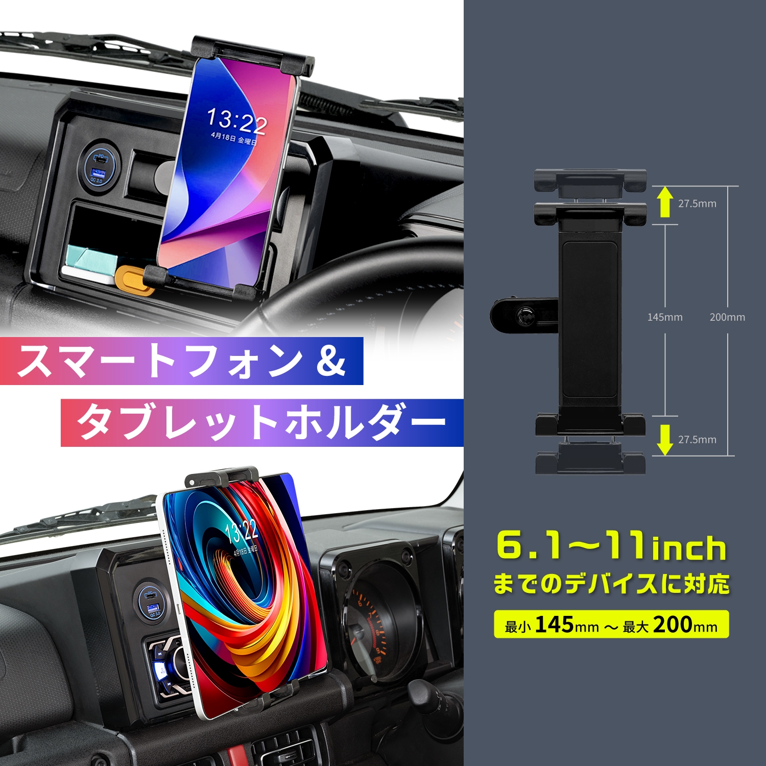 - 純正のオーディオパネルと付け替えることで、スマホやタブレットをベストポジションで取り付け可能。(6.1~11inchのデバイスに対応 最小145mm~最大200mmまで)