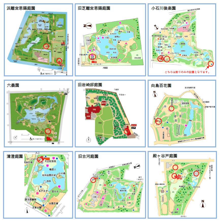 (浜離宮恩賜庭園・旧芝離宮恩賜庭園・小石川後楽園・六義園・旧岩崎邸庭園・向島百花園・清澄庭園・旧古河庭園・殿ヶ谷戸庭園)