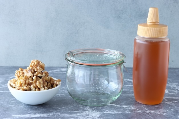 (3) 保存容器にくるみを入れ、くるみが浸かる程度にはちみつを入れる。