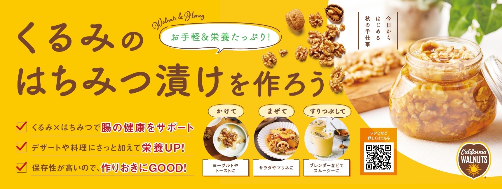 本キャンペーンは、近年の研究で腸の健康もサポートすることが明らかになったくるみと、同じく腸に嬉しいオリゴ糖等を含むはちみつと組み合わせることで、腸へのさらなる相乗効果を目指すものです。くるみをはちみつに漬けると酸化を防ぎ保存性を高めるので、たくさん作ってヨーグルトやトーストにかけたり、サラダやマリネにまぜたり、すりつぶしてスムージー等の幅広い料理に活用していただくことができます。