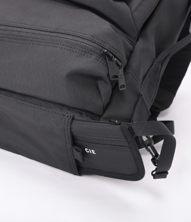 外ポケットは左右どちらでも片方の肩に掛けたままアクセス可能。ポケット下のスペースには上着を引っ掛けておける。下部の横長ポケットは内装に防水素材を使用。