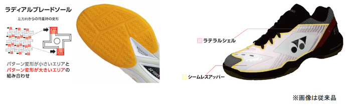 コートに吸い付くようなグリップ性を発揮する「ラディアルブレードソール」や推進力を向上させる「フェザーバウンスフォーム」、フィット感とホールド性を両立する「ラテラルシェル」などのテクノロジーにより、素足感覚の俊敏なフットワークをサポートします。