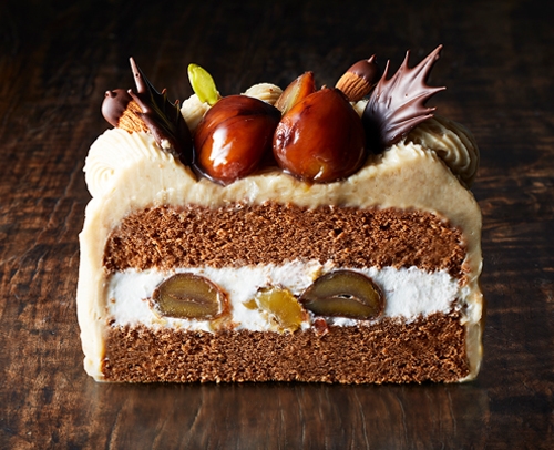 しっとりふわふわなチョコレート味のスポンジケーキに、愛媛県産の和栗を使った栗の渋皮煮と生クリームをサンドし、創業当初から変わらない特製モンブランクリームを絞りました。仕上げに秋の森林をイメージをして、どんぐりに見立てたアーモンドや葉っぱに見立てたチョコレートを飾り、最後に栗を丸ごと贅沢に乗せました。コクのあるモンブランクリームと軽やかなスポンジケーキのバランスが心地よく、栗やアーモンドの食感が秋の味覚を感じさせる逸品です。