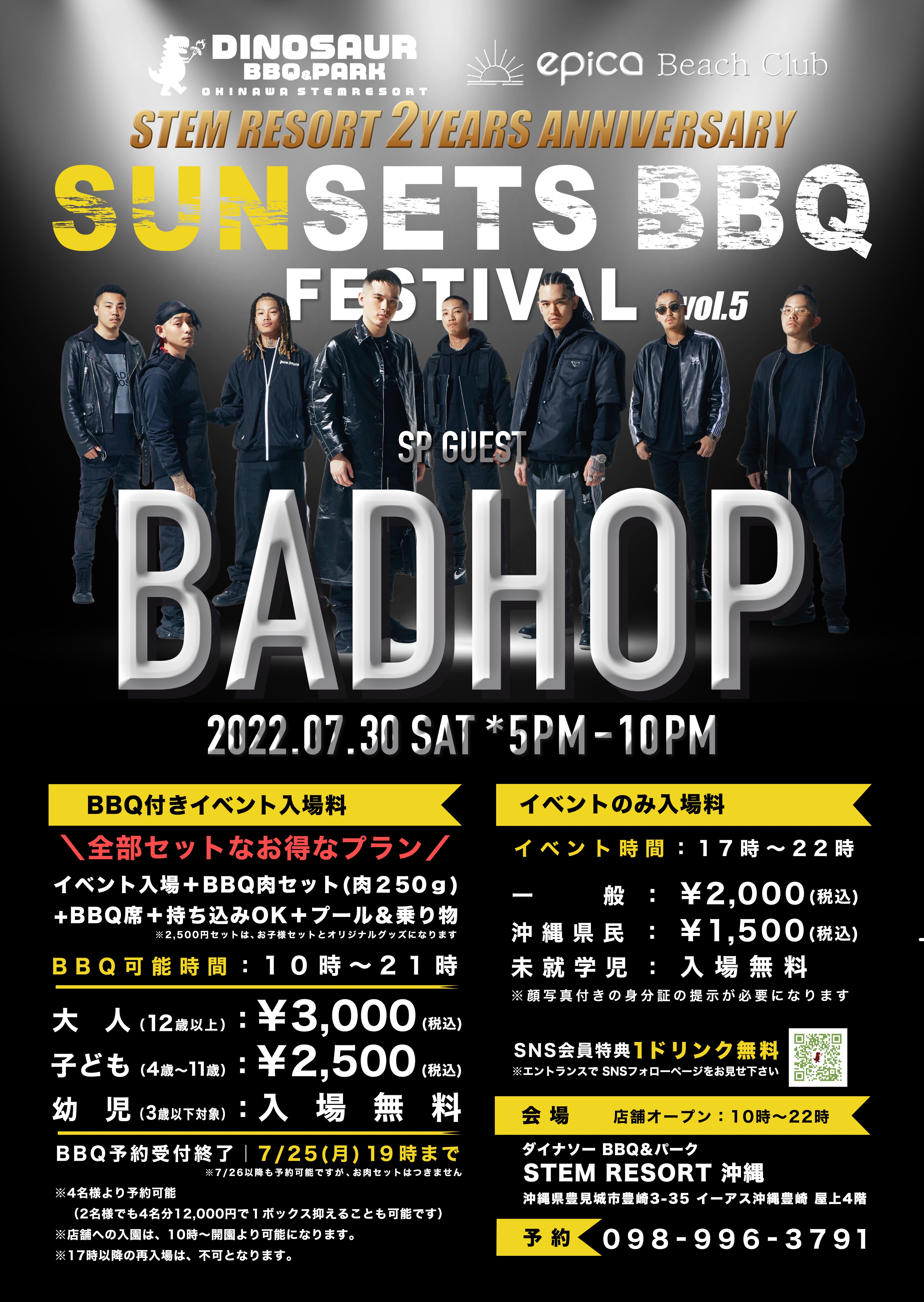 2022.7.30(土) 「STEM RESORT 2周年パーティー」 “ epica SUNSET BBQ FES vol.5 ” SPECIAL GUEST LIVE【BAD HOP】を 沖縄のイーアス豊崎 屋上の約2,500坪の 日本最大級の屋上BBQ&テーマパーク「STEM RESORT」にて開催!