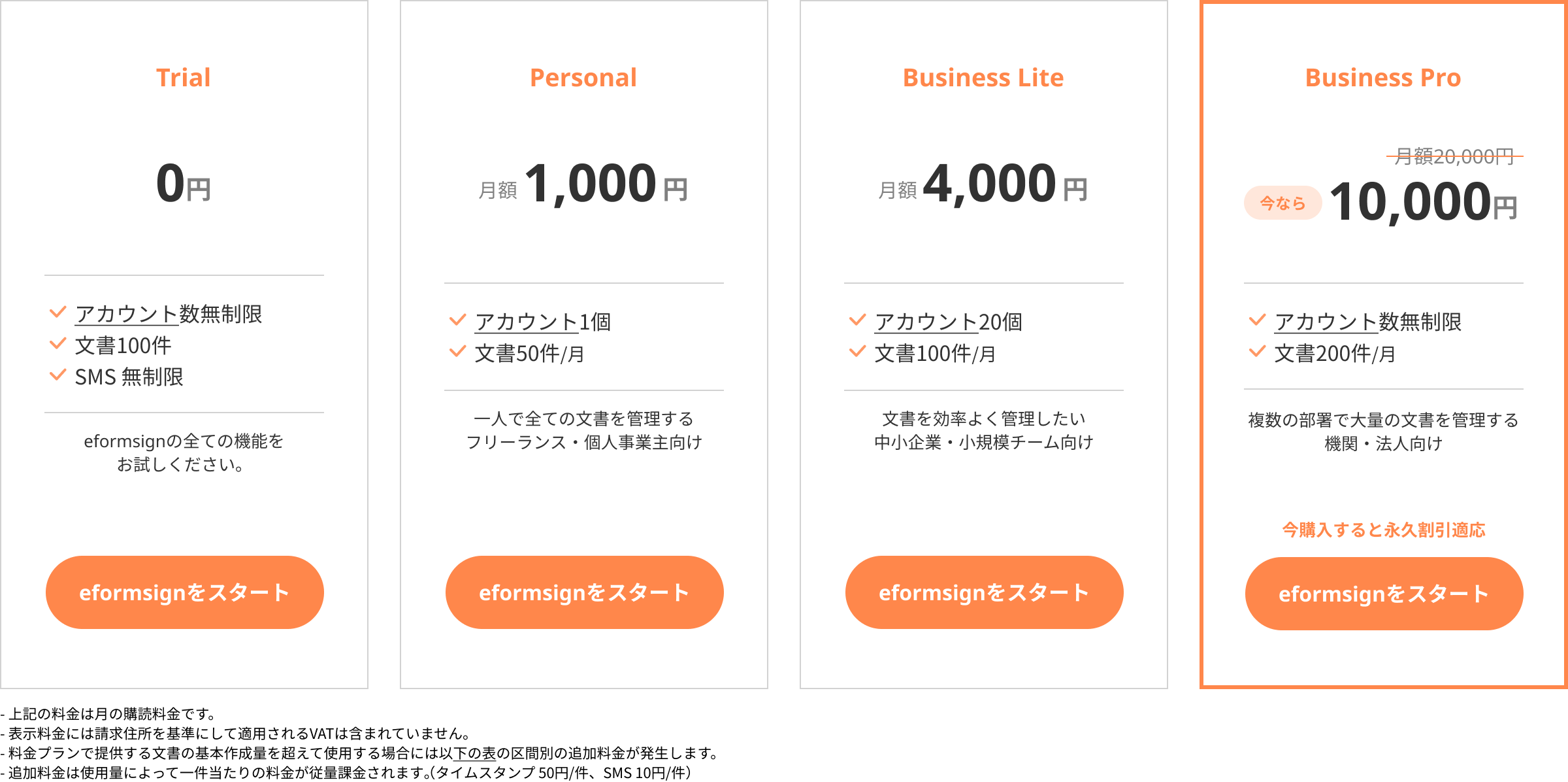 eformsignはサブスク形式で、部署間・フリーランスでも導入しやすい料金体系になっています。