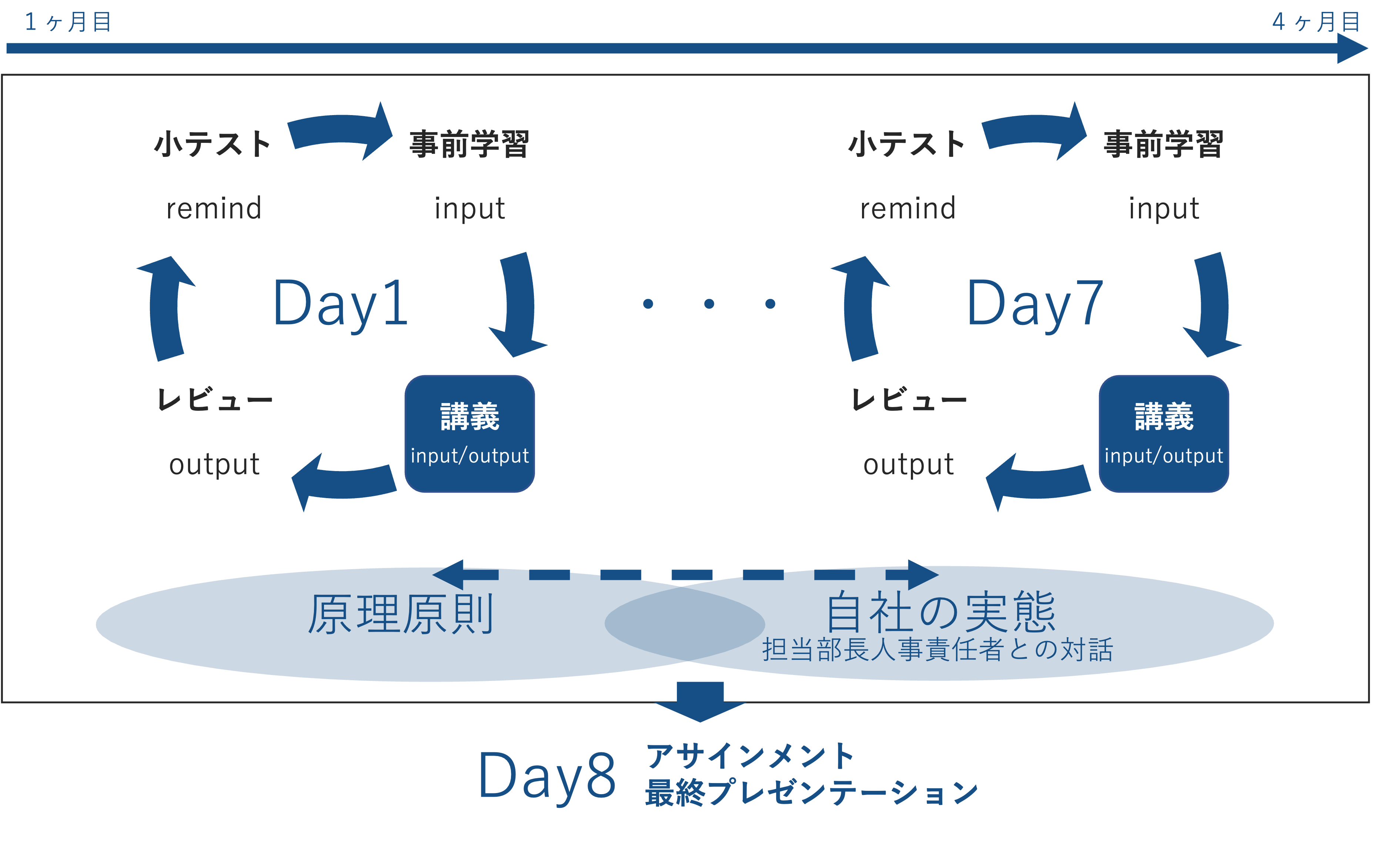 講義前の事前学習と事後のレビュー・小テストにより内容が定着すると共に、自社の人事責任者に自社の実態をヒアリングした上で改善策をアサインメントとして取りまとめることで、戦略人事としての実践的な力量を身につけていただく仕組みとなっています。