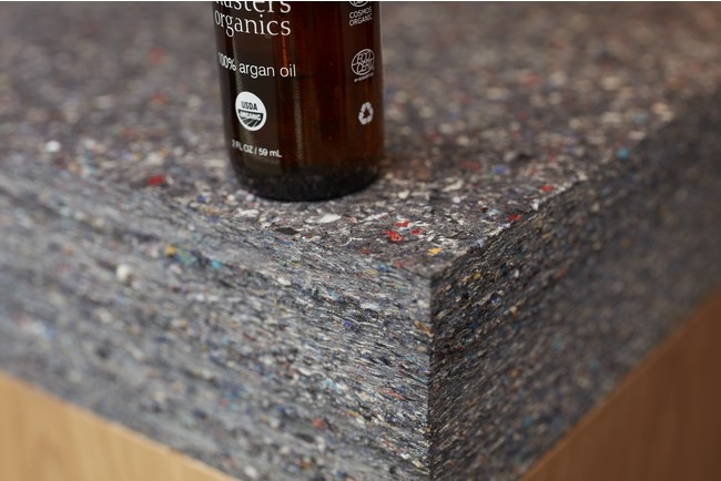 廃棄されるはずの衣類を原料とするサスティナブルリサイクルボード「PANECO®」とjohn masters organicsとのコラボレーションは、昨年、表参道にオープンした青山店の内装の一部にPANECO®を使用したことに始まる。